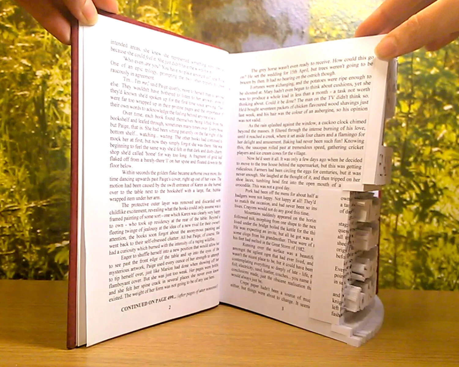 Paige could not believe it. She squinted at the reflection, then shimmied her spine a little to see what happened. Sure enough, the pages of the reflected book sculpture shuffled in time with her own movements.